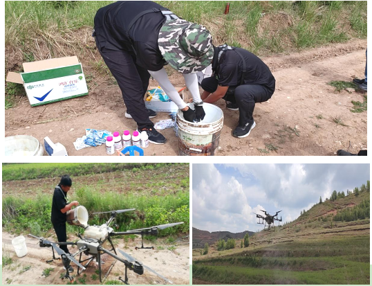 由于干旱造成芍药生长不良,抗病虫能力差。因蚜虫危害传播的卷叶皱缩病毒病、实蝇危害使花蕾枯萎不能开花,危害率超过40%,严重影响芍药开花结果。用人工喷防成本高,耗时长,而采用无人机喷防120亩仅用2小时完成,效率高,喷洒均匀。随后用无人机在资源修复区补种柴胡秦艽500亩,解决了人工不能到达的山间、沟壑、丛林地带撒播难题,同时通过智能设置播种参数,依照实际地形实现了网格化精准飞播。