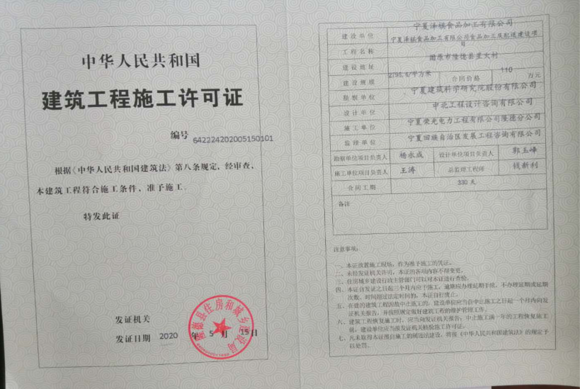 宁夏泽琪食品加工有限公司加工及配送建设项目施工许可证